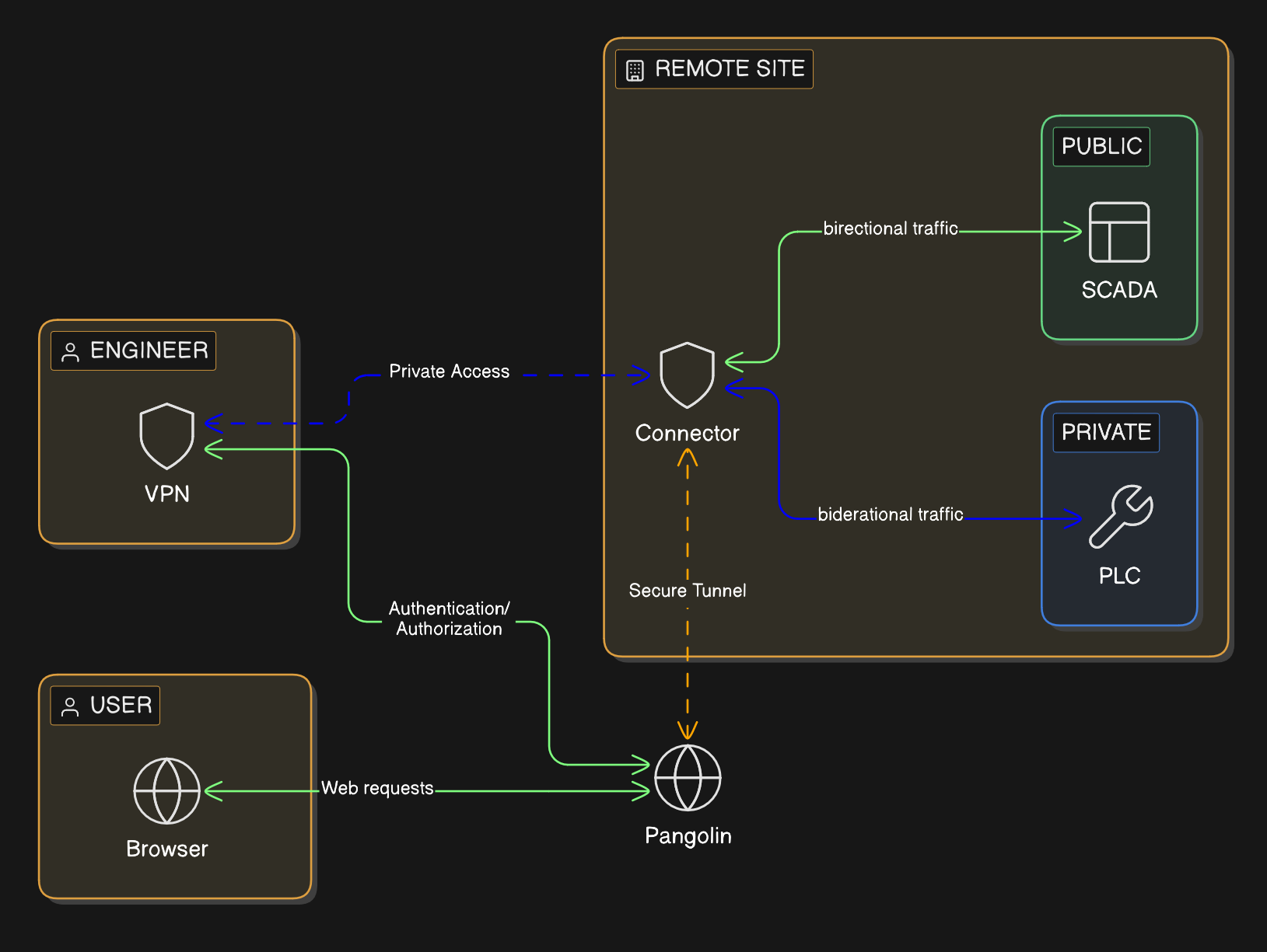 Pangolin can protect the private SCADA application behind an authenticated access layer and provide narrower private access for PLCs, engineering tools, and other internal industrial systems.