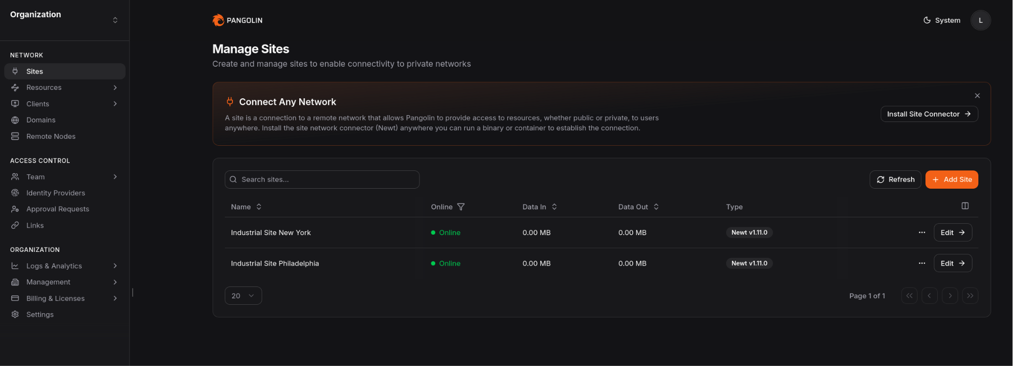 Pangolin can support both sides of that model. In Pangolin, you define a site for the remote industrial network and install a connector on a Windows or Linux system inside that environment.