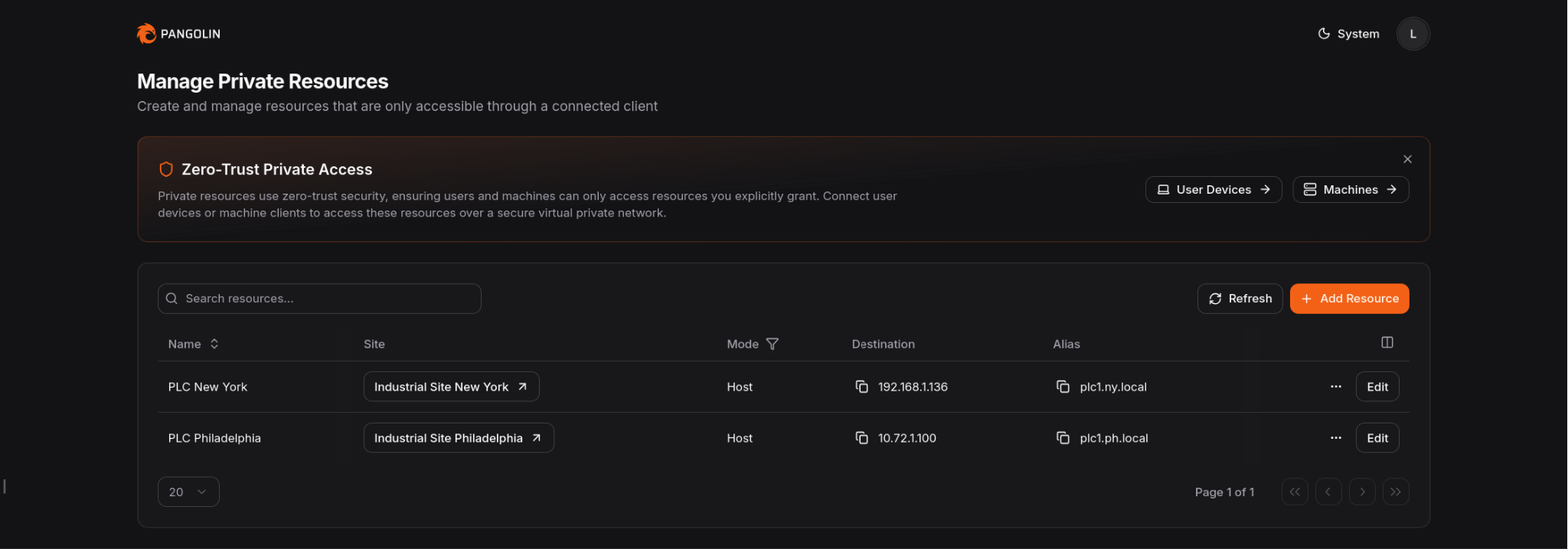When the job requires deeper OT access, Pangolin can provide Private Resources for specific hosts, subnets, and ports. Users authenticate with their identity and use client software only when that deeper path is required. Admins can keep access narrow instead of dropping users onto the full network.